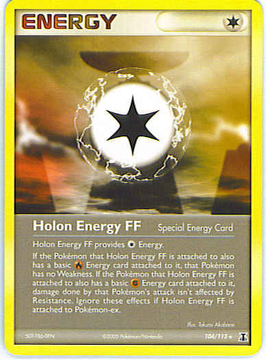 Evne Holon Energy FF provides C Energy. If the Pokemon that Holon Energy FF is attached to also has a basic R Energy card attached to it, that Pokemon has no Weakness. If the Pokemon that Holon Energy is attached to also has a basic F Energy card attached to it, damage done by that Pokemon's attack isn't affected by Resistance. Ignore these effects if Holon Energy FF is attached to Pokemon-ex.