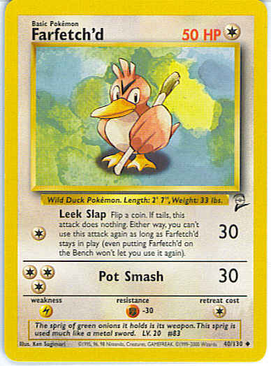 [C] Leek Slap (30) Flip a coin. If tails, this attack does nothing. Either way, you can't use this attack again as long as Farfetch'd stays in play (even after benching Farfetch'd).