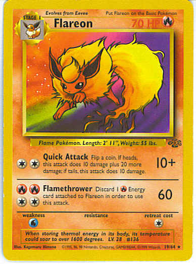 | Type | Fire | | Pokemon serie | Jungle | | Stadie | Stage 1 | | HP | 70 | | Sjældenhed | Rare | | Tilbagetrækning | 1 | | Svaghed | W | | Kortnummer | 19 | | Evne |