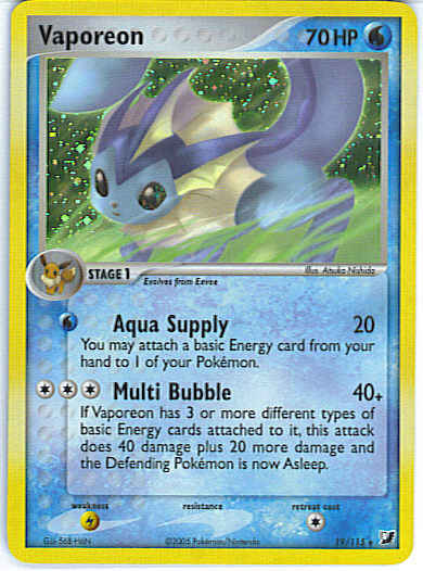 [CCC] Multi Bubble (40+) If Vaporeon has 3 or more different types of basic Energy cards attached to it, this attack does 40 damage plus 20 more damage and the Defending Pokemon is now Asleep.