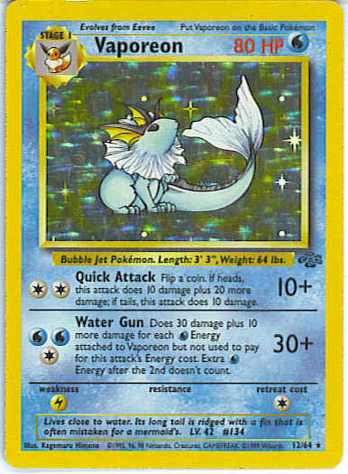| Type | Water | | Pokemon serie | Jungle | | Stadie | Stage 1 | | HP | 80 | | Sjældenhed | Rare | | Tilbagetrækning | 1 | | Svaghed | L | | Kortnummer | 12 | | Evne |