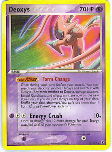 | Type | Psychic | | Pokemon serie | Deoxys | | Stadie | Basic | | HP | 70 | | Sjældenhed | Rare | | Tilbagetrækning | 1 | | Svaghed | P | | Kortnummer | 17 | | Evne | on it are now on the new Pokemon.) If you do, put Deoxys on top of your deck. Shuffle your deck afterward. You can't use more than 1 Form Change Poke-Power each turn. (Poke-POWER)