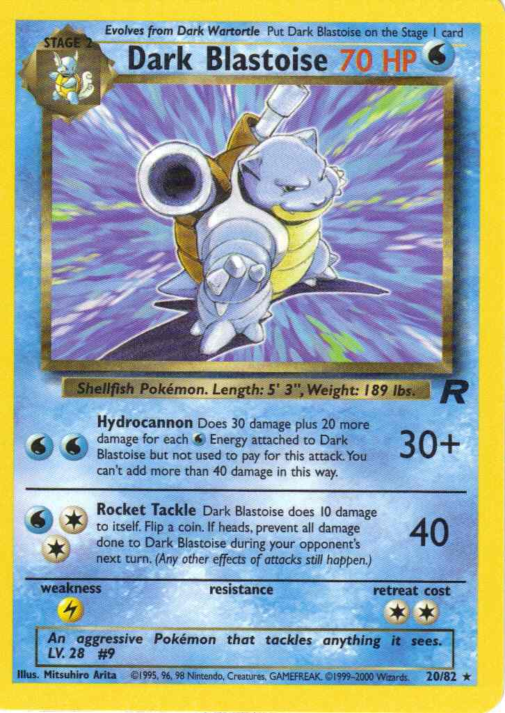 | Type | Water | | Pokemon serie | Team Rocket | | Stadie | Stage 2 | | HP | 70 | | Sjældenhed | Rare | | Tilbagetrækning | 2 | | Svaghed | L | | Kortnummer | 20 | | Evne |