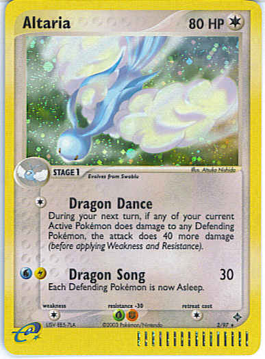 | Type | Colorless | | Pokemon serie | Dragon | | Stadie | Stage 1 | | HP | 80 | | Sjældenhed | Rare | | Tilbagetrækning | 1 | | Modstand | FG | | Svaghed | C | | Kortnummer | 2 | | Evne |