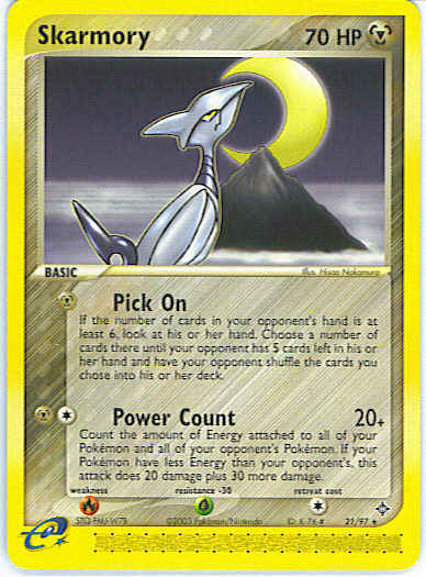 | Type | Metal | | Pokemon serie | Dragon | | Stadie | Basic | | HP | 70 | | Sjældenhed | Rare | | Tilbagetrækning | 1 | | Modstand | G | | Svaghed | R | | Kortnummer | 21 | | Evne | [M] Pick On - If the number of cards in your opponent's hand is at least 6, look at his or her hand. Choose a number of cards there until your opponent has 5 cards left in his or her hand and have your opponent shuffle the cards you chose into his or her deck. [CM] Power Count (20+) Count the amount of Energy attached to all of your Pokemon and all of your opponent's Pokemon. If your Pokemon have less Energy than your opponent's, this attack does 20 damage plus 30 more damage. | | Evne2 | [M] Pick On - If the number of cards in your opponent's hand is at least 6, look at his or her hand. Choose a number of cards there until your opponent has 5 cards left in his or her hand and have your opponent shuffle the cards you chose into his or her deck. [CM] Power Count (20+) Count the amount of Energy attached to all of your Pokemon and all of your opponent's Pokemon. If your Pokemon have less Energy than your opponent's, this attack does 20 damage plus 30 more damage. | | Kunstner | Hisao Nakamura |