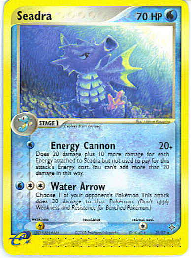 | Evne | [W] Energy Cannon (20+) Does 20 damage plus 10 more damage for each Energy attached to Seadra but not used to pay for this attack's Energy cost. You can't add more than 20 damage in this way. [CCW] Water Arrow - Choose 1 of your opponent's Pokemon. This attack does 30 damage to that Pokemon. (Don't apply Weakness and Resistance for Benched Pokemon.) |