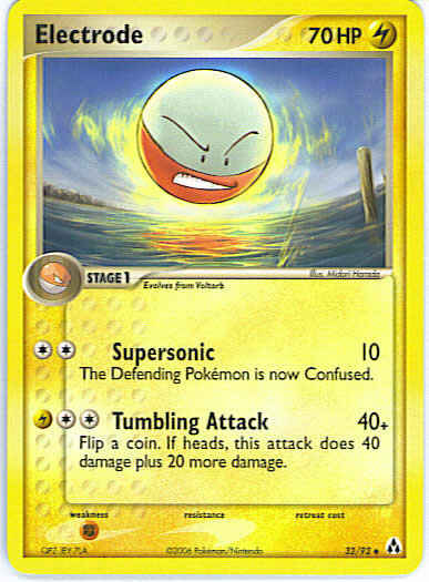 | Type | Lightning | | Pokemon serie | Legend Maker | | Stadie | Stage 1 | | HP | 70 | | Sjældenhed | Uncommon | | Svaghed | F | | Kortnummer | 32 | | Evne | [CC] Supersonic (10) The Defending Pokemon is now Confused. [CCL] Tumbling Attack (40+) Flip a coin. If heads, this attack does 40 damage plus 20 more damage. | | Evne2 | [CC] Supersonic (10) The Defending Pokemon is now Confused. [CCL] Tumbling Attack (40+) Flip a coin. If heads, this attack does 40 damage plus 20 more damage. | | Kunstner | Midori Harada |