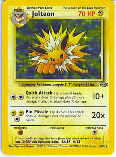 | Type | Lightning | | Pokemon serie | Jungle | | Stadie | Stage 1 | | HP | 70 | | Sjældenhed | Rare | | Tilbagetrækning | 1 | | Svaghed | F | | Kortnummer | 4 | | Evne |
