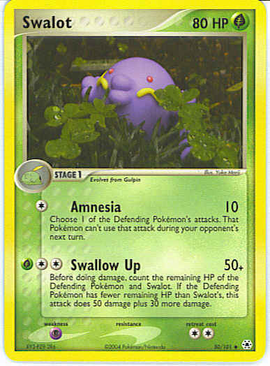 [CCG] Swallow Up (50+) Before doing damage, count the remaining HP of the Defending Pokemon and Swalot. If the Defending Pokemon has fewer remaining HP than Swalot's, this attack does 50 damage plus 30 more damage.