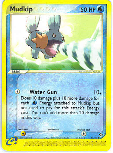 | Type | Water | | Pokemon serie | Dragon | | Stadie | Basic | | HP | 50 | | Sjældenhed | Common | | Tilbagetrækning | 1 | | Svaghed | L | | Kortnummer | 65 | | Evne | [C] Water Gun (10+) Does 10 damage for each W Energy attached to Mudkip but not used to pay for this attack's Energy cost. You can't add more than 20 damage in this way. | | Evne2 | [C] Water Gun (10+) Does 10 damage for each W Energy attached to Mudkip but not used to pay for this attack's Energy cost. You can't add more than 20 damage in this way. | | Kunstner | Hironobu Yoshida |