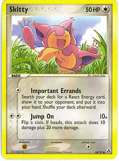 | Type | Colorless | | Pokemon serie | Legend Maker | | Stadie | Basic | | HP | 50 | | Sjældenhed | Common | | Tilbagetrækning | 1 | | Svaghed | F | | Kortnummer | 64 | | Evne | [C] Important Errands - Search your deck for a React Energy card, show it to your opponent, and put it into your hand. Shuffle your deck afterward. [CC] Jump On (10+) Flip a coin. If heads, this attack does 10 damage plus 20 more damage. | | Evne2 | [C] Important Errands - Search your deck for a React Energy card, show it to your opponent, and put it into your hand. Shuffle your deck afterward. [CC] Jump On (10+) Flip a coin. If heads, this attack does 10 damage plus 20 more damage. | | Kunstner | Satoshi Ohta |