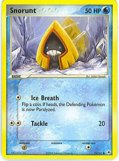 | Type | Water | | Pokemon serie | Hidden Legends | | Stadie | Basic | | HP | 50 | | Sjældenhed | Common | | Tilbagetrækning | 1 | | Svaghed | M | | Kortnummer | 73 | | Evne | [C] Ice Breath - Flip a coin. If heads, the Defending Pokemon is now Paralyzed. [CC] Tackle (20) | | Evne2 | [C] Ice Breath - Flip a coin. If heads, the Defending Pokemon is now Paralyzed. [CC] Tackle (20) | | Kunstner | Midori Harada |