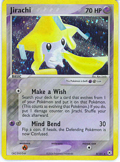 [C] Make a Wish - Search your deck for a card that evolves from 1 of your Pokemon and put it on that Pokemon. (This counts as evolving that Pokemon.) If you do, put 1 damage counter on Jirachi. Shuffle your deck afterward.