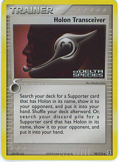 Evne Search your deck for a Supporter card that has Holon in its name, show it to your opponent, and put it into your hand. Shuffle your deck afterward. Or, search your discard pile for a Supporter card that has Holon in its name, show it to your opponent, and put it into your hand.
