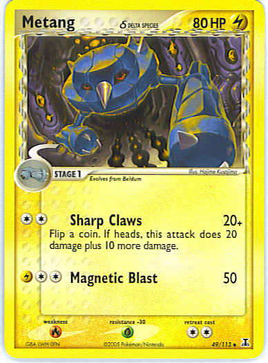 | Type | Lightning | | Pokemon serie | Delta Species | | Stadie | Stage 1 | | HP | 80 | | Sjældenhed | Uncommon | | Tilbagetrækning | 2 | | Modstand | G | | Svaghed | R | | Kortnummer | 49 | | Evne |