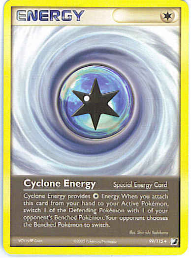 Evne Cyclone Energy provides C Energy. When you attach this card from your hand to your Active Pokemon, switch 1 of the Defending Pokemon with 1 of your opponent's Benched Pokemon. Your opponent chooses the Benched Pokemon to switch.