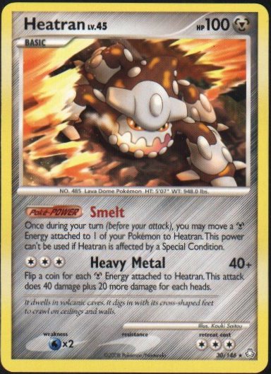 Evne [CCC] Heavy Metal (40+) Flip a coin for each M Energy attached to Heatran. This attack does 40 damage plus 20 more damage for each heads.