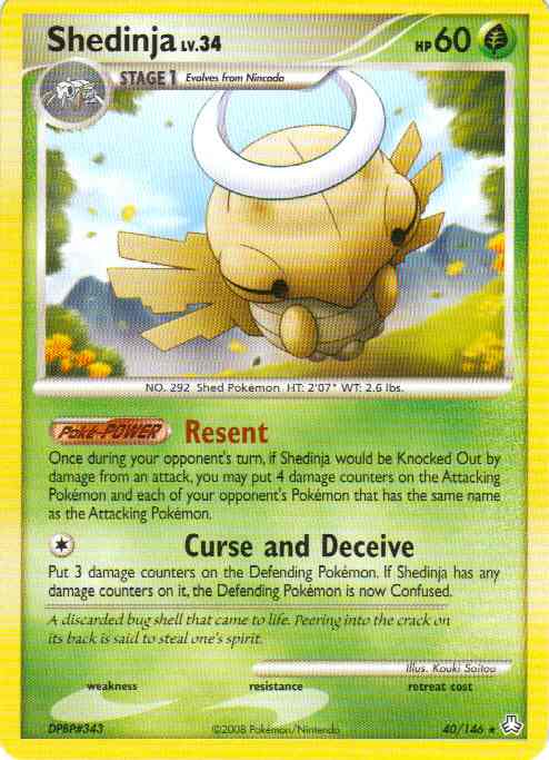 [C] Curse and Deceive - Put 3 damage counters on the Defending Pokemon. If Shedinja has any damage counters on it, the Defending Pokemon is now Confused.