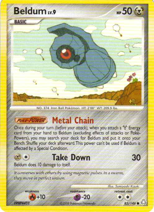 | Type | Metal | | Pokemon serie | Legends Awakened | | Stadie | Basic | | HP | 50.0 | | Sjældenhed | Common | | Tilbagetrækning | 2.0 | | Modstand | P-20 | | Svaghed | R+10 | | Kortnummer | 83 | | Evne | of attacks or Poke-Powers), you may search your deck for Beldum and put it onto your Bench. Shuffle your deck afterward. This power can't be used if Beldum is affected by a Special Condition. (Poke-POWER)
