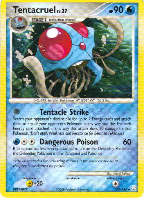 | | Evne2 | [0] Tentacle Strike - Search your opponent's discard pile for up to 2 Energy cards and attach them to any of your opponent's Pokemon in any way you like. For each Energy card attached in this way, this attack does 20 damage to that Pokemon. (Don't apply Weakness and Resistance for Benched Pokemon.) [CCW] Dangerous Poison (60) If Tentacruel has less Energy attached to it than the Defending Pokemon, the Defending Pokemon is now Paralyzed and Poisoned.