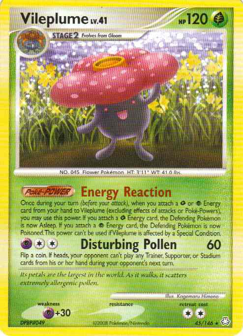 | Type | Grass | | Pokemon serie | Legends Awakened | | Stadie | Stage 2 | | HP | 120.0 | | Sjældenhed | Rare | | Tilbagetrækning | 2.0 | | Svaghed | P+30 | | Kortnummer | 45 | | Evne | of attacks or Poke-Powers), you may use this power. If you attach a G Energy card, the Defending Pokemon is now Asleep. If you attach a P Energy card, the Defending Pokemon is now Poisoned. This power can't be used if Vileplume is affected by a Special Condition. (Poke-POWER)