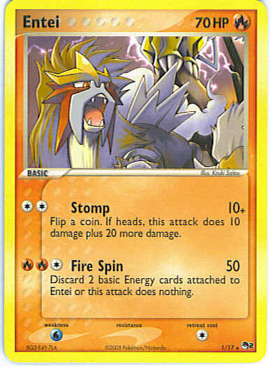 | Type | Fire | | Pokemon serie | OP Series 2 | | Stadie | Basic | | HP | 70 | | Sjældenhed | Rare | | Tilbagetrækning | 1 | | Svaghed | W | | Kortnummer | 1 | | Evne | [CC] Stomp (10+) Flip a coin. If heads, this attack does 10 damage plus 20 more damage. [CRR] Fire Spin (50) Discard 2 basic Energy cards attached to Entei or this attack does nothing.