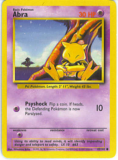 | Type | Psychic | | Pokemon serie | Base | | Stadie | Basic | | HP | 30 | | Sjældenhed | Common | | Svaghed | P | | Kortnummer | 43 | | Evne |