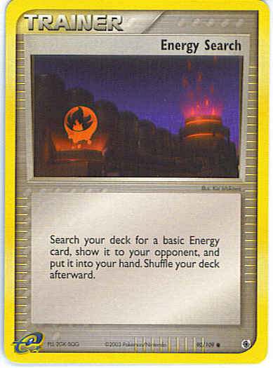Search your deck for a basic Energy card, show it to your opponent, and put it into your hand. Shuffle your deck afterward.