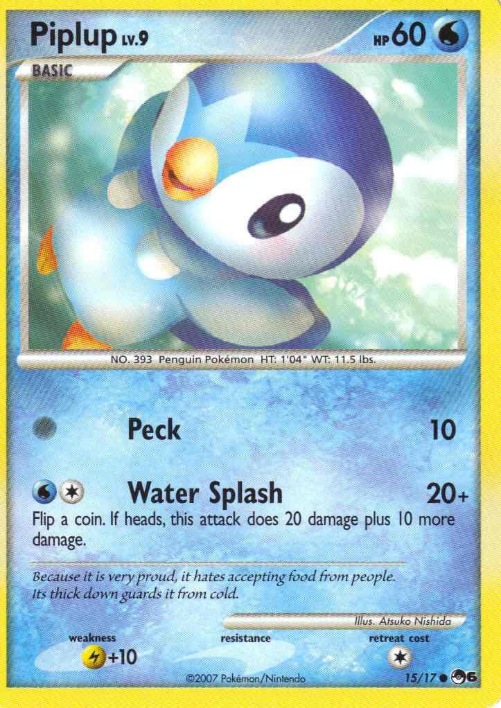 | Type | Water | | Pokemon serie | OP Series 6 | | Stadie | Basic | | HP | 60 | | Sjældenhed | Common | | Tilbagetrækning | 1 | | Svaghed | L+10 | | Kortnummer | 15 | | Evne | [0] Peck (10) [CW] Water Splash (20+) Flip a coin. If heads, this attack does 20 damage plus 10 more damage.