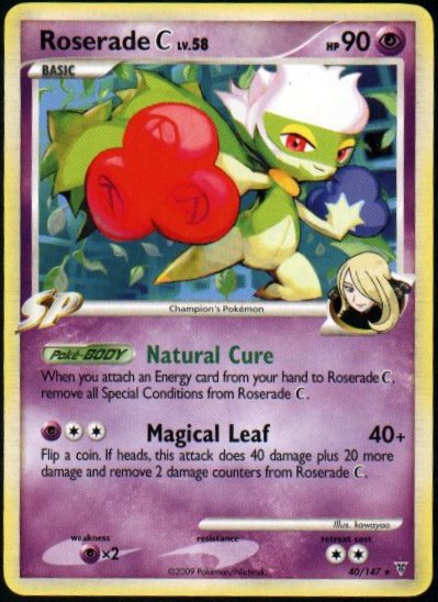 Evne [PCC] Magical Leaf (40+) Flip a coin. If heads, this attack does 40 damage plus 20 more damage and remove 2 damage counters from Roserade C.