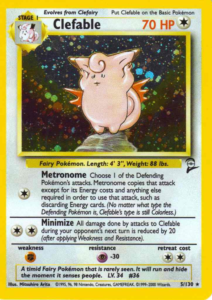Evne [C] Metronome - Choose 1 of the Defending Pokemon's attacks. Metronome copies that attack except for its Energy costs and anything else required in order to use that attack, such as discarding Energy cards. (No matter what type the Defending Pokemon is, Clefable's type is still Colorless.)