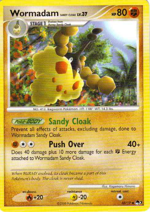 | Type | Fighting | | Pokemon serie | OP Series 7 | | Stadie | Stage 1 | | HP | 80.0 | | Sjældenhed | Uncommon | | Tilbagetrækning | 1.0 | | Modstand | L-20 | | Svaghed | R+20 | | Kortnummer | 10 | | Evne | of attacks, excluding damage, done to Wormadam Sandy Cloak. (Poke-BODY)