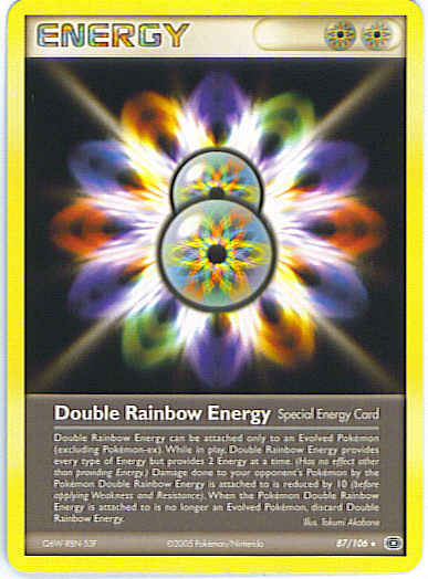 Double Rainbow Energy can be attached only to an Evolved Pokemon (excluding Pokemon-ex). While in play, Double Rainbow Energy provides every type of Energy but provides 2 Energy at a time. (Doesn't count as a basic Energy when not in play and has no effect other than providing Energy.) Damage done to your opponent's Pokemon by the Pokemon Double Rainbow Energy is attached to is reduced by 10 (after applying Weakness and Resistance). When the Pokemon Double Rainbow Energy is attached to is no longer an Evolved Pokemon, discard Double Rainbow Energy.
