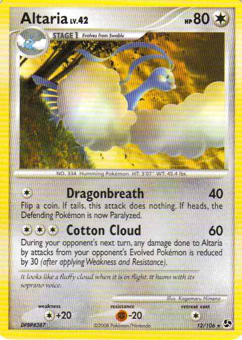[CCC] Cotton Cloud (60) During your opponent's next turn, any damage done to Altaria by attacks from your opponent's Evolved Pokemon is reduced by 30 (after applying Weakness and Resistance).