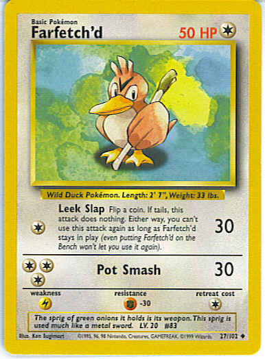 Evne [C] Leek Slap (30) Flip a coin. If tails, this attack does nothing. Either way, you can't use this attack again as long as Farfetch'd stays in play (even after benching Farfetch'd).