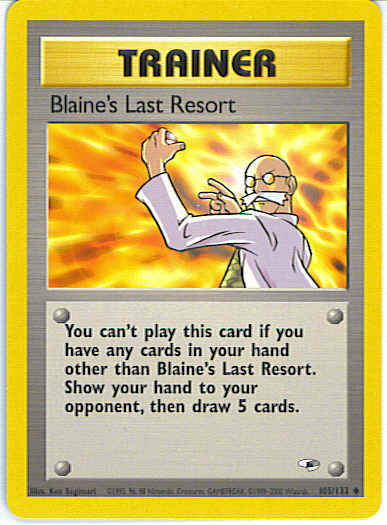 Evne You can't play this card if you have any cards in your hand other than Blaine's Last Resort. Show your hand to your opponent, then draw 5 cards.