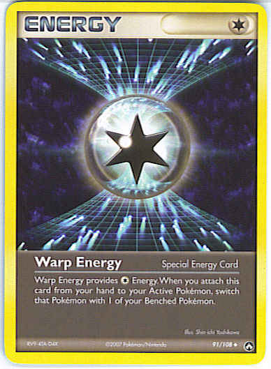 Warp Energy provides C Energy. When you attach this card from your hand to your Active Pokemon, switch that Pokemon with 1 of your Benched Pokemon.