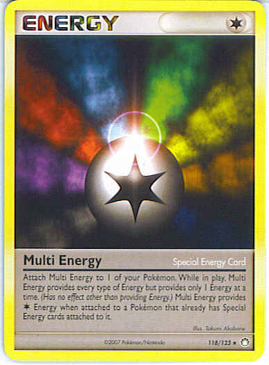 Attach Multi Energy to 1 of your Pokemon. While in play, Multi Energy provides every type of Energy but provides only 1 Energy at a time. (Has no effect other than providing Energy.) Multi Energy provides C Energy when attached to a Pokemon that already has Special Energy cards attached to it.
