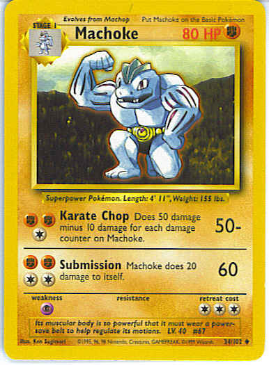 | Type | Fighting | | Pokemon serie | Base | | Stadie | Stage 1 | | HP | 80 | | Sjældenhed | Uncommon | | Tilbagetrækning | 3 | | Svaghed | P | | Kortnummer | 34 | | Evne |