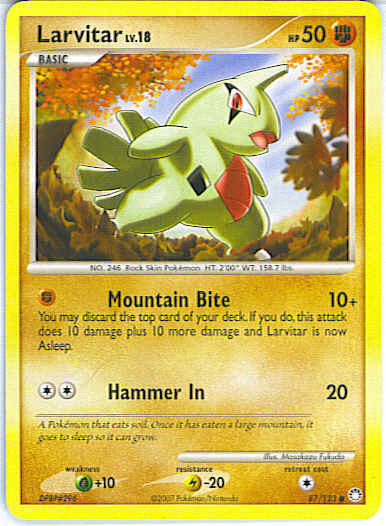 [F] Mountain Bite (10+) You may discard the top card of your deck. If you do, this attack does 10 damage plus 10 more damage and Larvitar is now Asleep.