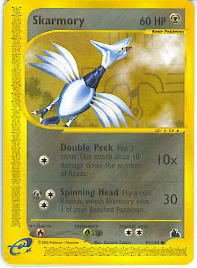 | Type | Metal | | Pokemon serie | Skyridge | | Stadie | Basic | | HP | 60 | | Sjældenhed | Common | | Tilbagetrækning | 2 | | Modstand | G | | Svaghed | R | | Kortnummer | 97 | | Evne | [C] Double Peck (10x) Flip 2 coins. This attack does 10 damage times the number of heads. [CCM] Spinning Head (30) Flip a coin. If heads, switch Skarmory with 1 of your Benched Pokemon.