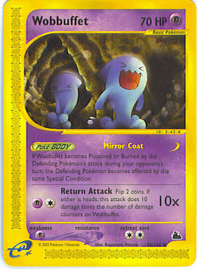 | Type | Psychic | | Pokemon serie | Skyridge | | Stadie | Basic | | HP | 70 | | Sjældenhed | Uncommon | | Tilbagetrækning | 2 | | Svaghed | P | | Kortnummer | 45 | | Evne | [CP] Return Attack (10x) Flip 2 coins. If either is heads, this attack does 10 damage times the number of damage counters on Wobbuffet.
