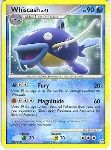 | Type | Water | | Pokemon serie | Mysterious Treasures | | Stadie | Stage 1 | | HP | 90 | | Sjældenhed | Rare | | Tilbagetrækning | 3 | | Modstand | L-20 | | Svaghed | G+30 | | Kortnummer | 40 | | Evne |