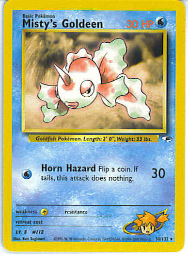 | Type | Water | | Pokemon serie | Gym Heroes | | Stadie | Basic | | HP | 30 | | Sjældenhed | Rare | | Svaghed | L | | Kortnummer | 30 | | Evne |