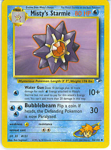 Evne [W] Water Gun (10+) Does 10 damage plus 10 more damage for each W Energy attached to Misty's Starmie but not used to pay for this attack's Energy cost. You can't add more than 20 damage in this way.