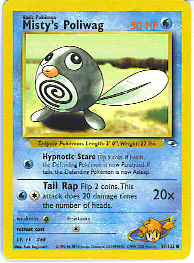 | Type | Water | | Pokemon serie | Gym Heroes | | Stadie | Basic | | HP | 50 | | Sjældenhed | Common | | Tilbagetrækning | 1 | | Svaghed | G | | Kortnummer | 87 | | Evne |
