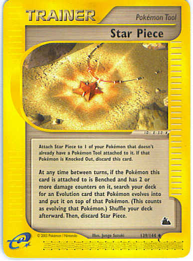 Evne2At any time between turns, if the Pokemon this card is attached to is Benched and has 2 or more damage counters in it, search your deck for an Evolution card that Pokemon evolves into and put it on top of that Pokemon. (This counts as evolving that Pokemon.) Shuffle your deck afterward. Then, discard Star Piece.