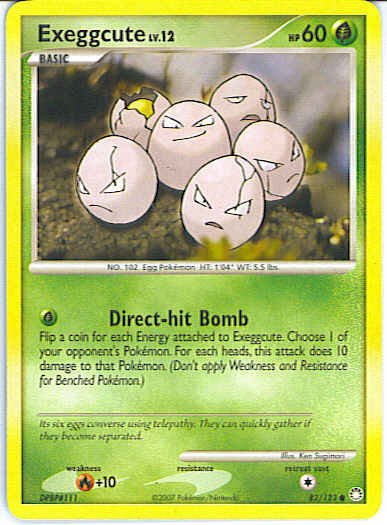 [G] Direct-hit Bomb - Flip a coin for each Energy attached to Exeggcute. Choose 1 of your opponent's Pokemon, and this attack does 10 damage to that Pokemon for each heads you flipped.