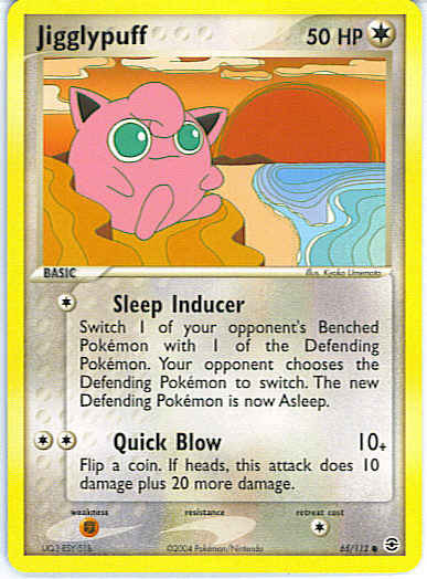 Evne2[C] Sleep Inducer - Switch 1 of your opponent's Benched Pokemon with 1 of the Defending Pokemon. Your opponent chooses the Defending Pokemon to switch. The new Defending Pokemon is now Asleep.
