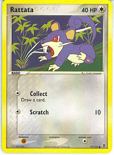 | Type | Colorless | | Pokemon serie | Fire Red Leaf Green | | Stadie | Basic | | HP | 40 | | Sjældenhed | Common | | Tilbagetrækning | 1 | | Svaghed | F | | Kortnummer | 77 | | Evne | [C] Collect - Draw a card. [C] Scratch (10) | | Evne2 | [C] Collect - Draw a card. [C] Scratch (10) | | Kunstner | Kyoko Umemoto |